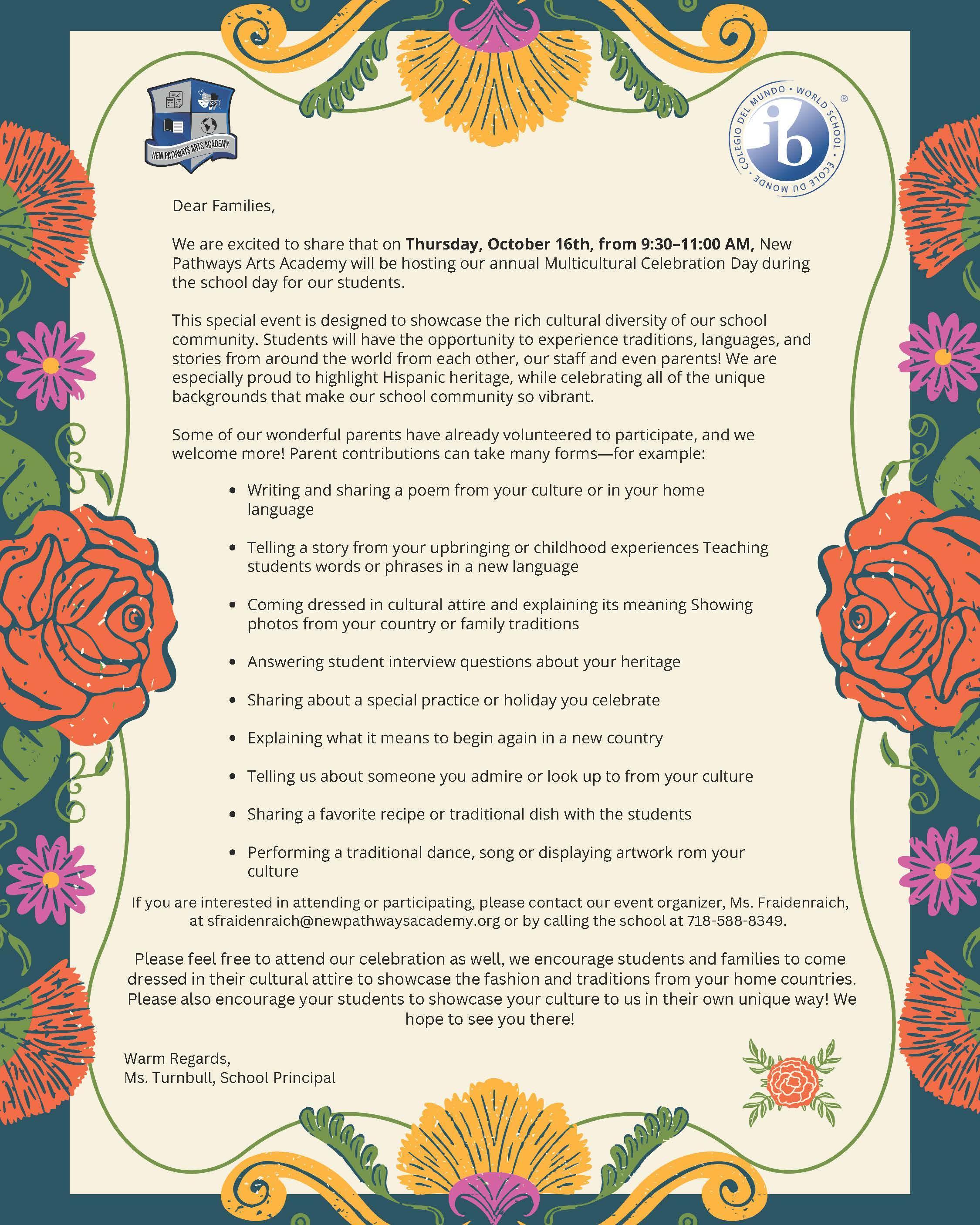 - Share Your Heritage: Parents are invited to volunteer! You can share a poem, tell a story, explain cultural attire, share a recipe, perform a traditional dance, or display artwork from your culture.